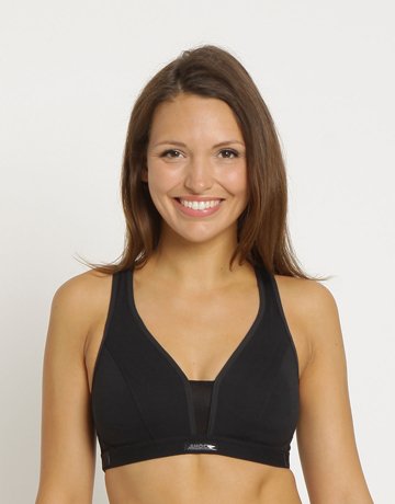 Plunge Sports Bra - Black - This level 3 sports bra from Shock Absorber has a feminine plunge front and racer back design for full freedom of movement and is a compression style bra designed to push the breast against the chest to reduce movement and bounce. Available up to DD cup it has adjustable side fastenings to customise the fit and the moisture wicking, breathable fabric keeps you dry during your workout.